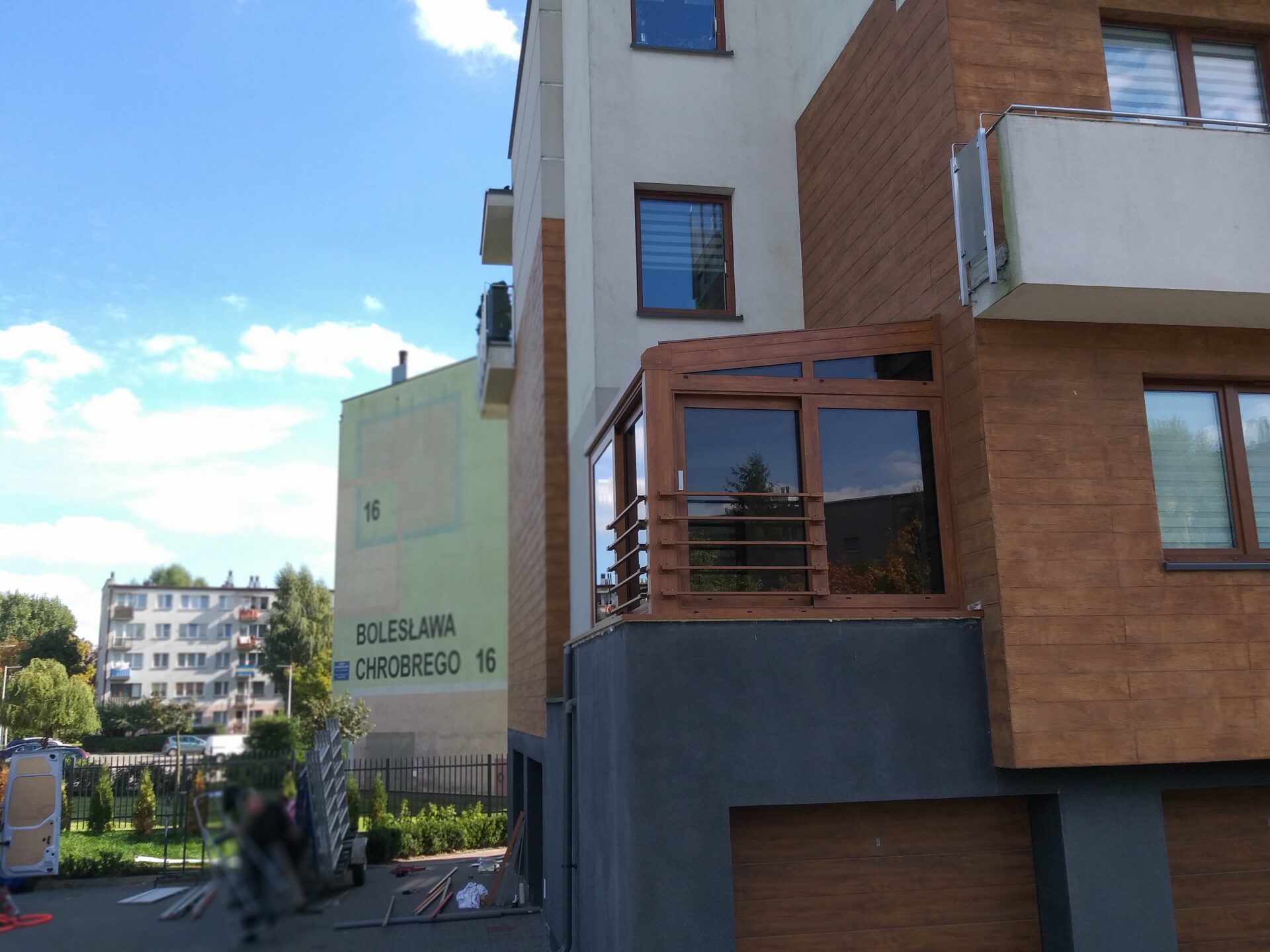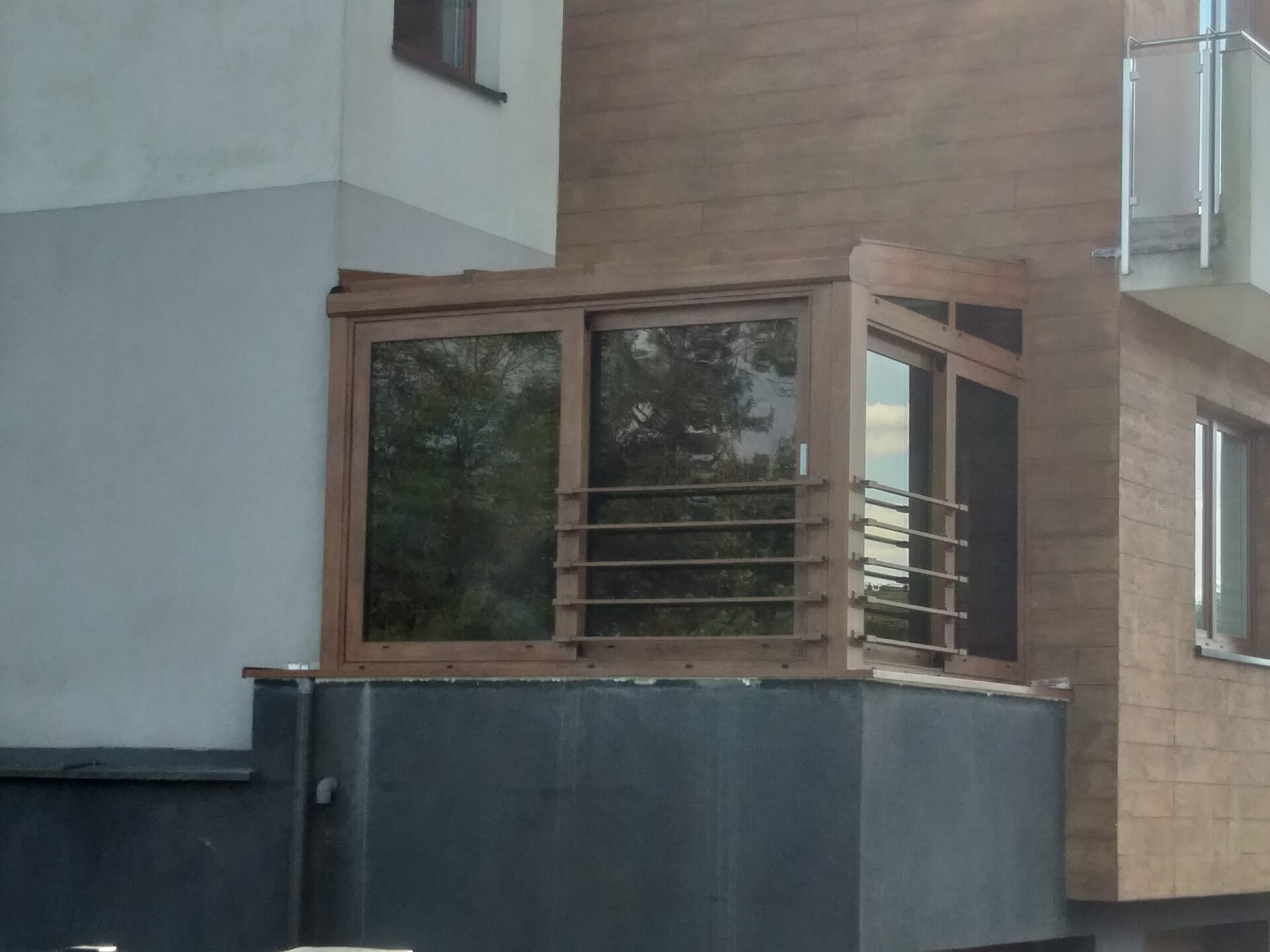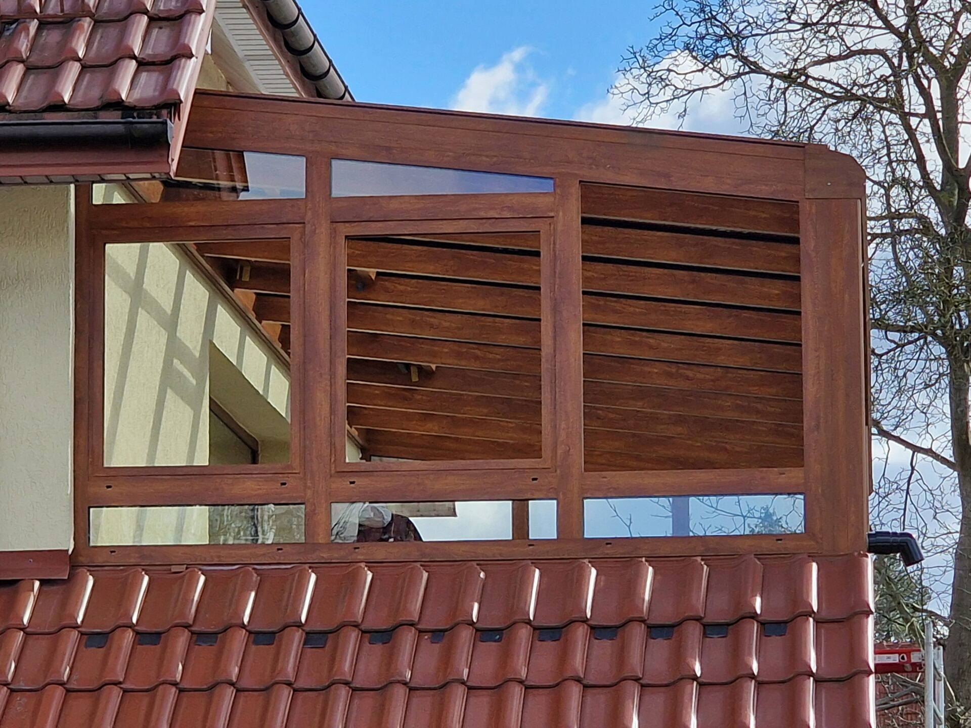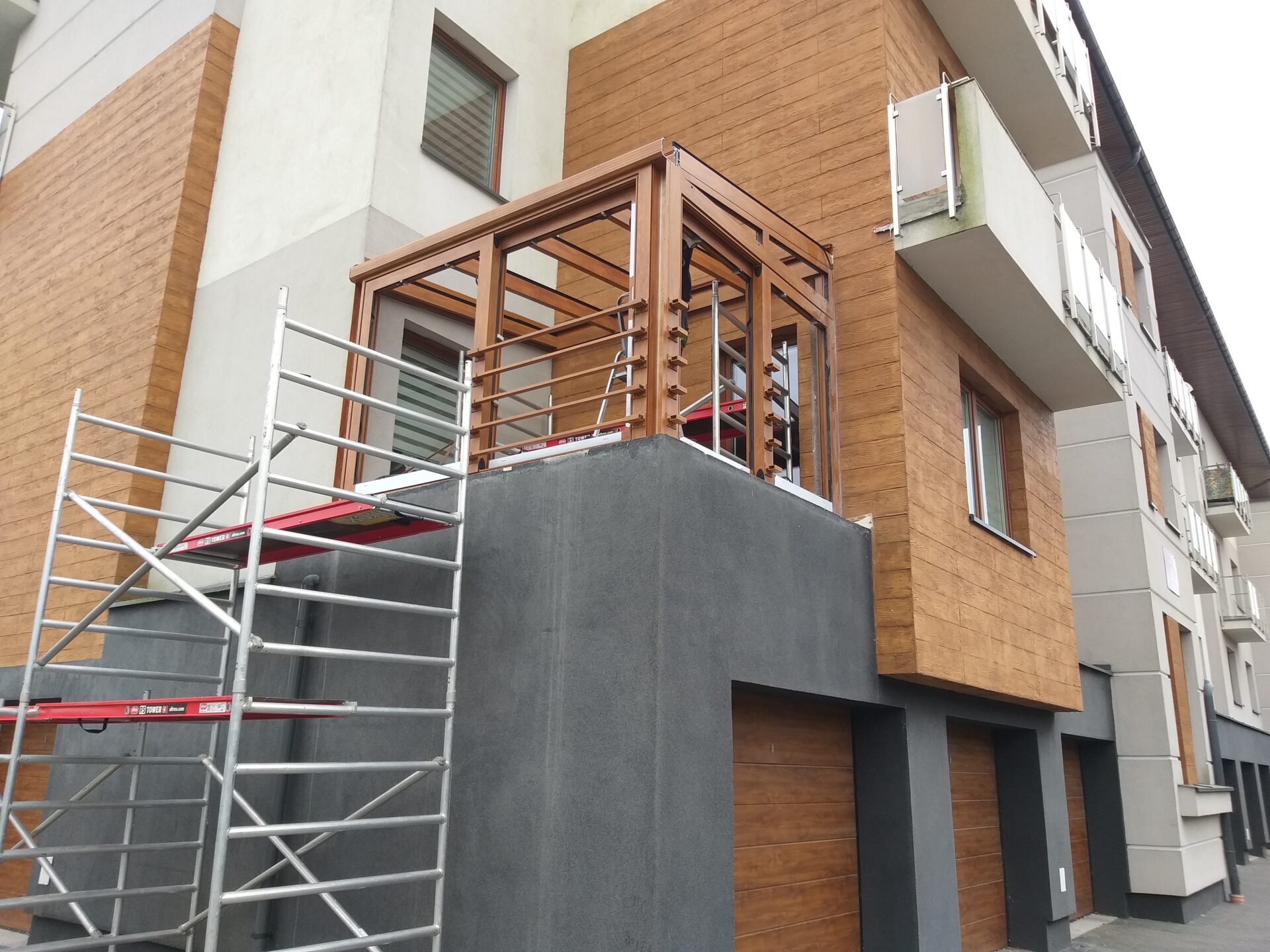 Na balkonie jednego ze szczecińskich domów powstała elegancka zabudowa ogrodowa w klasycznym, brązowym wykończeniu.
