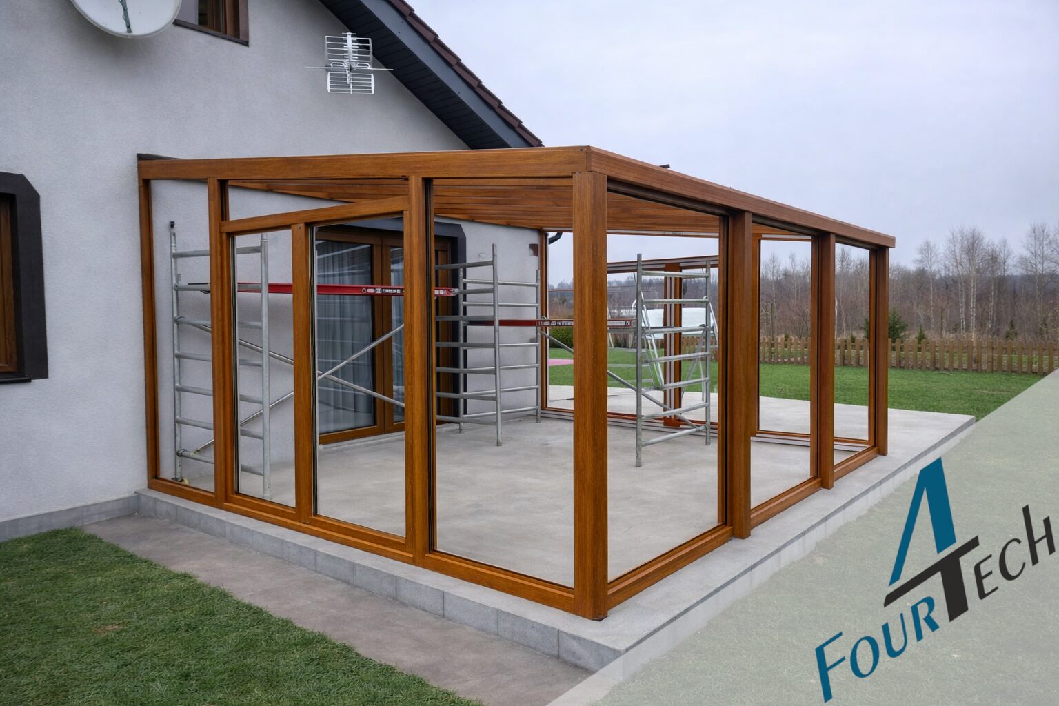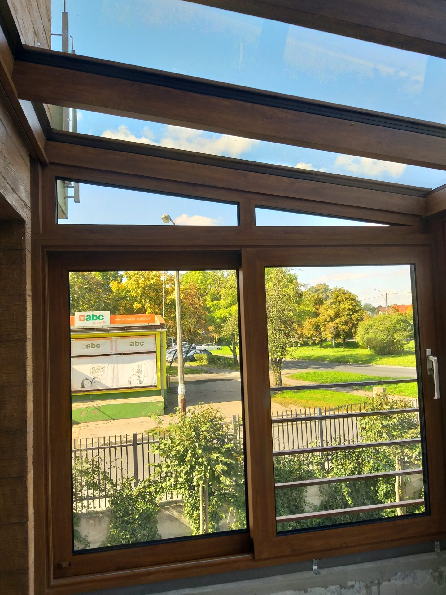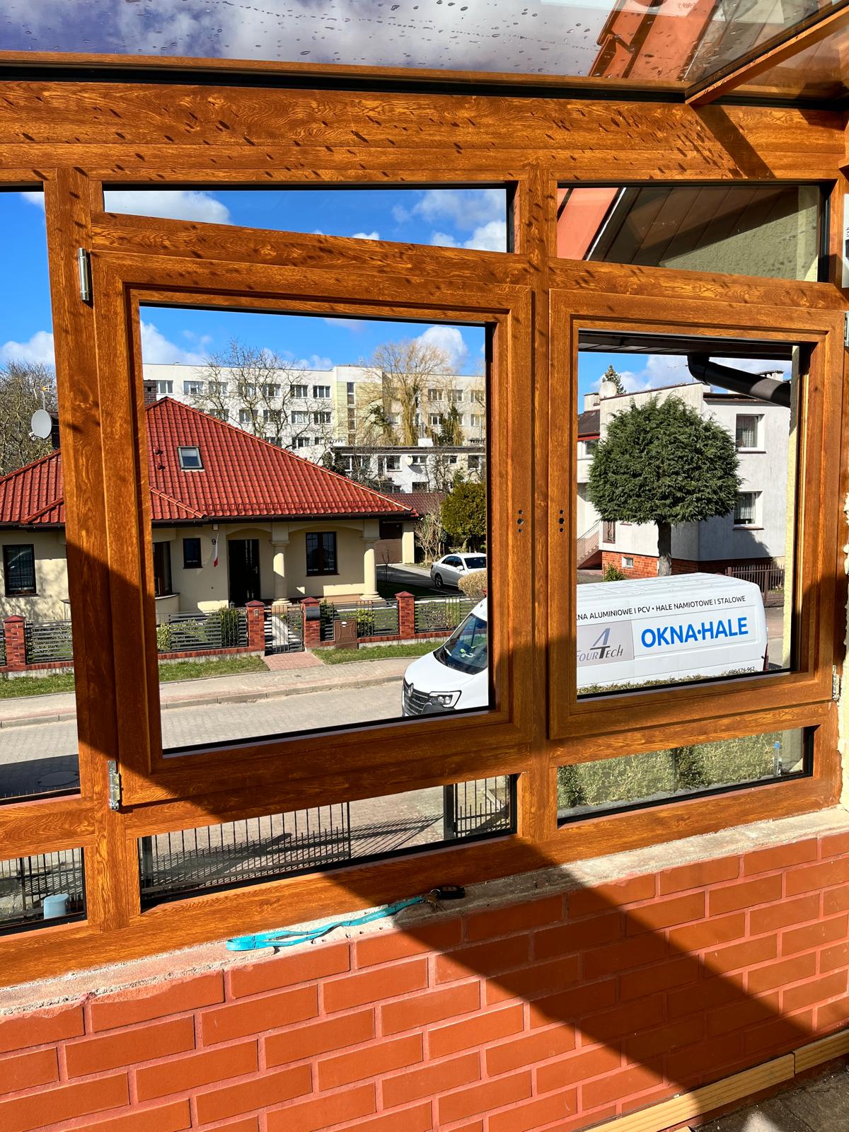 Na piętrze budynku w Koszalinie wykonaliśmy efektowny ogród zimowy w kolorze złotego dębu,
