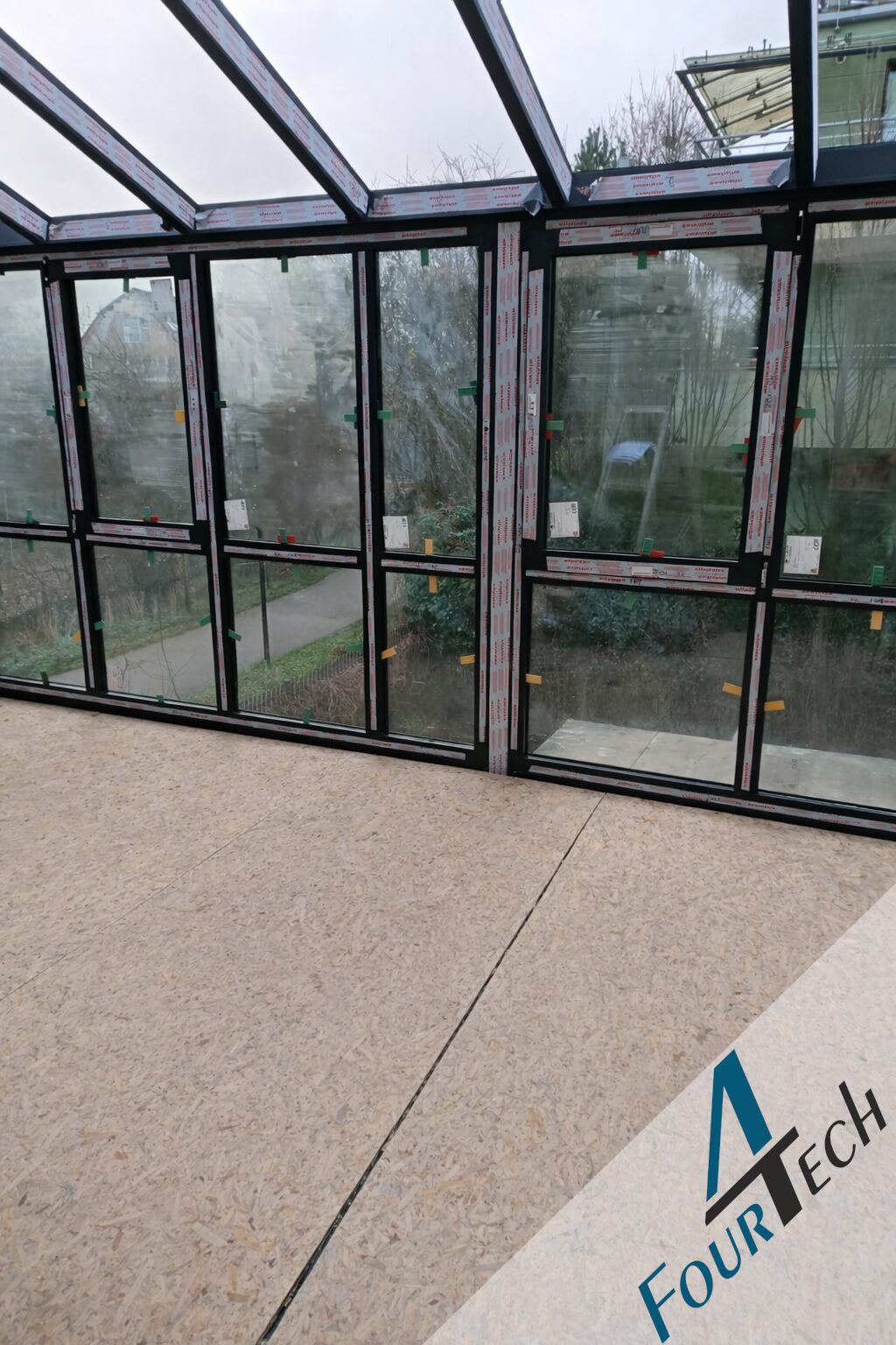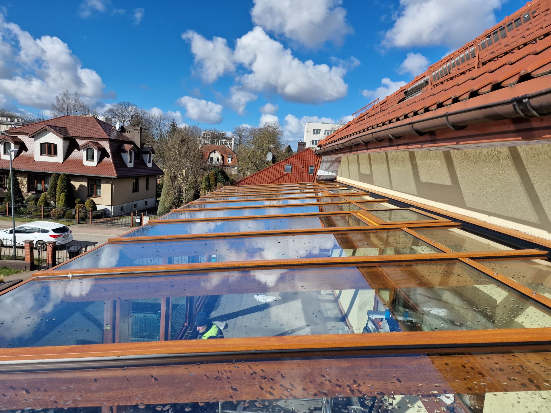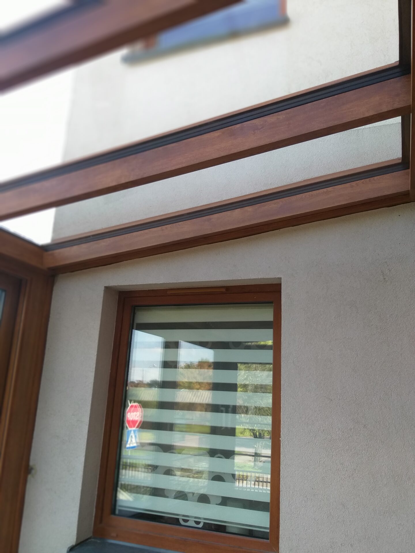 Na piętrze budynku w Koszalinie wykonaliśmy efektowny ogród zimowy w kolorze złotego dębu,