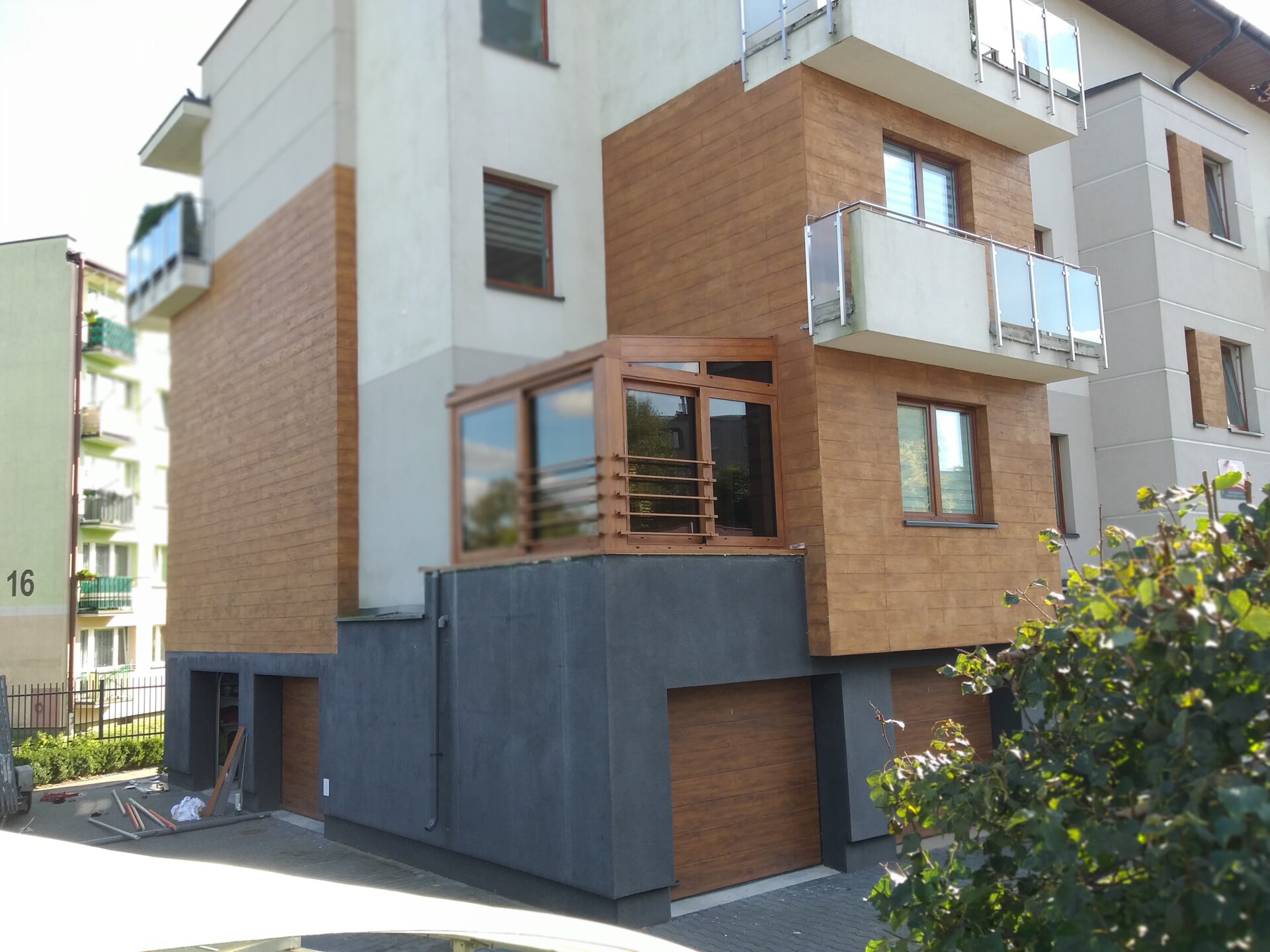 Ciepła kolorystyka harmonijnie wpisuje się w elewację budynku, nadając całości spójny i estetyczny wygląd.