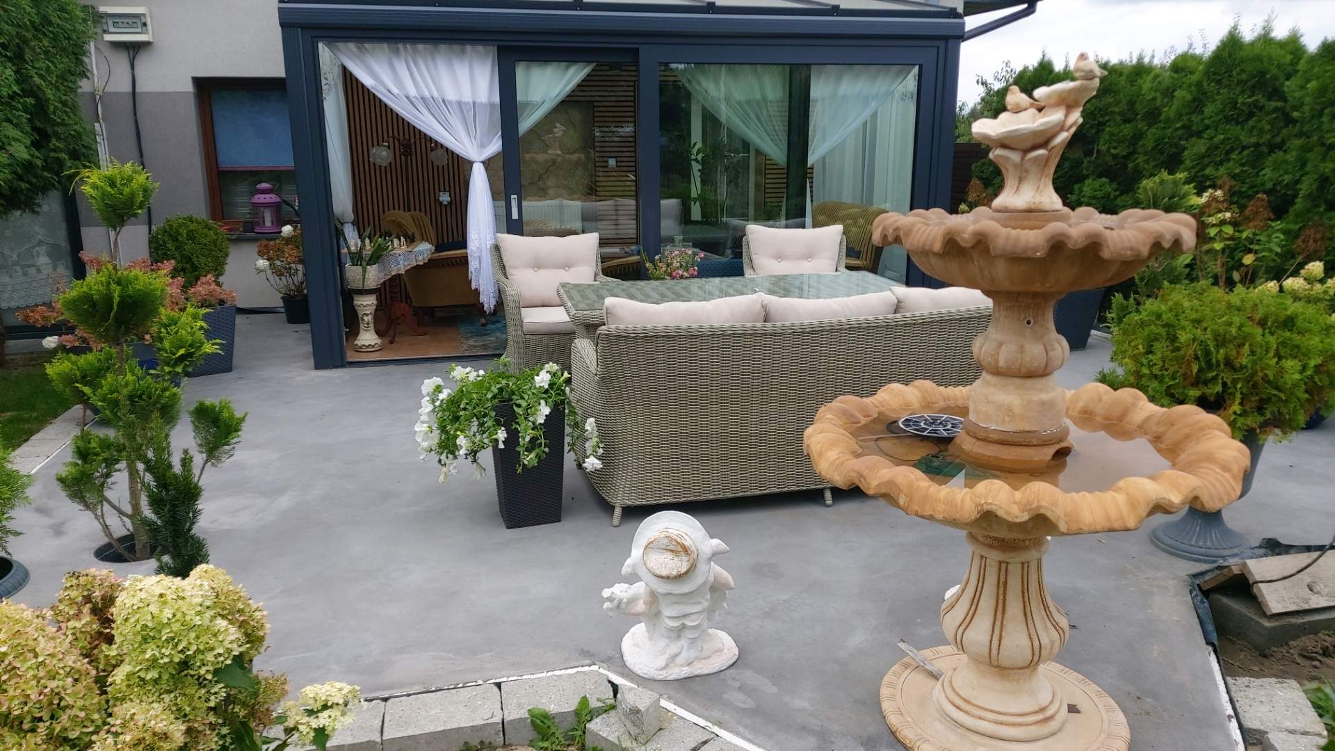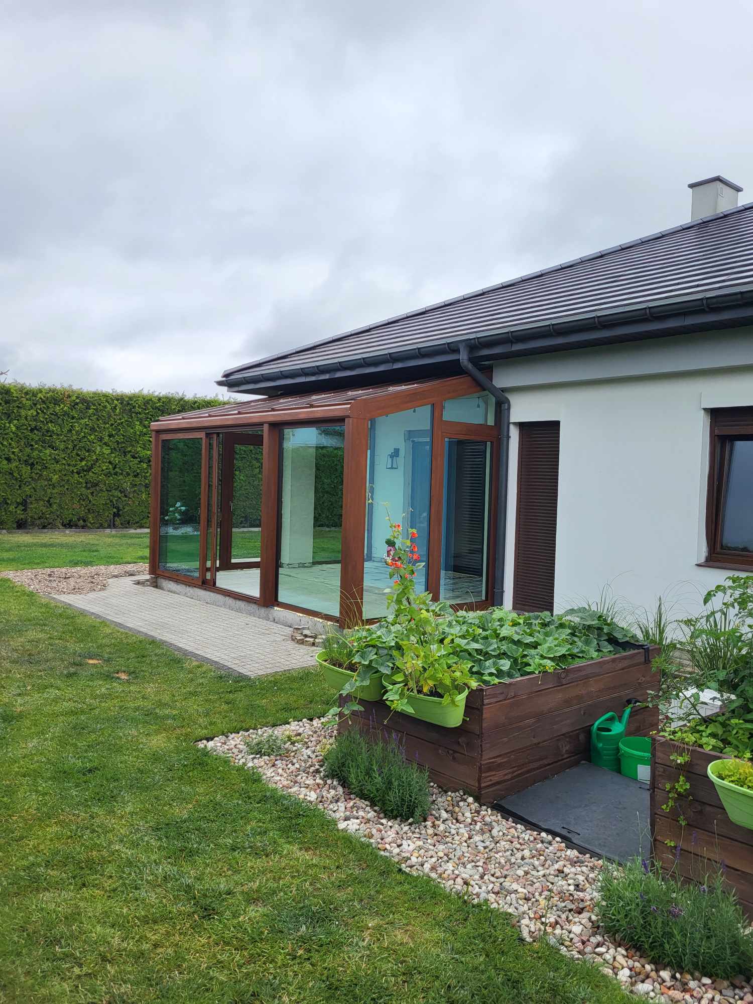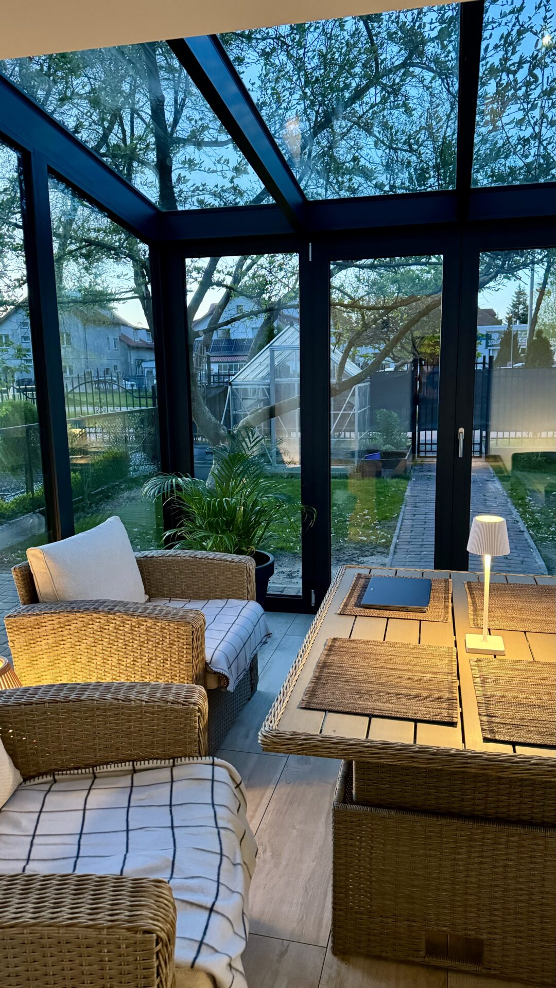 a wykończenie w ciemnym odcieniu podkreśla elegancję i nowoczesność. To nie tylko ogród, lecz prawdziwe przedłużenie domu,