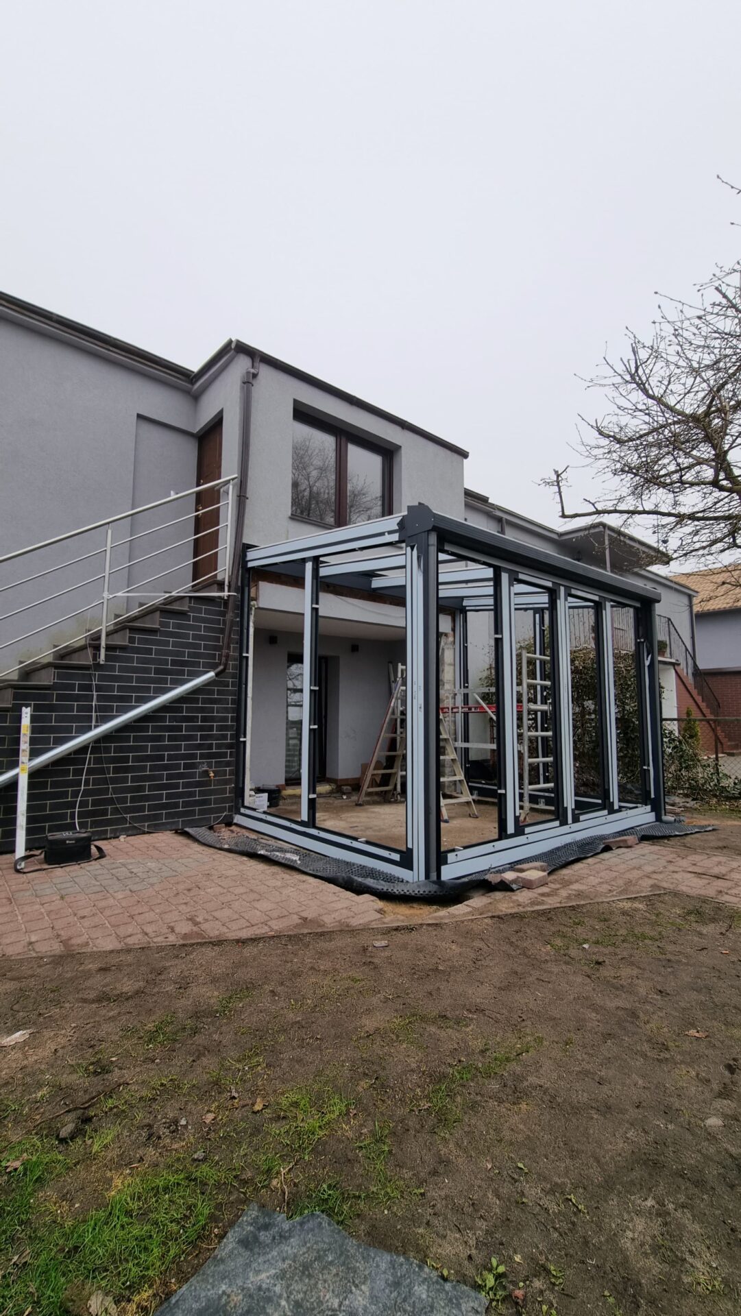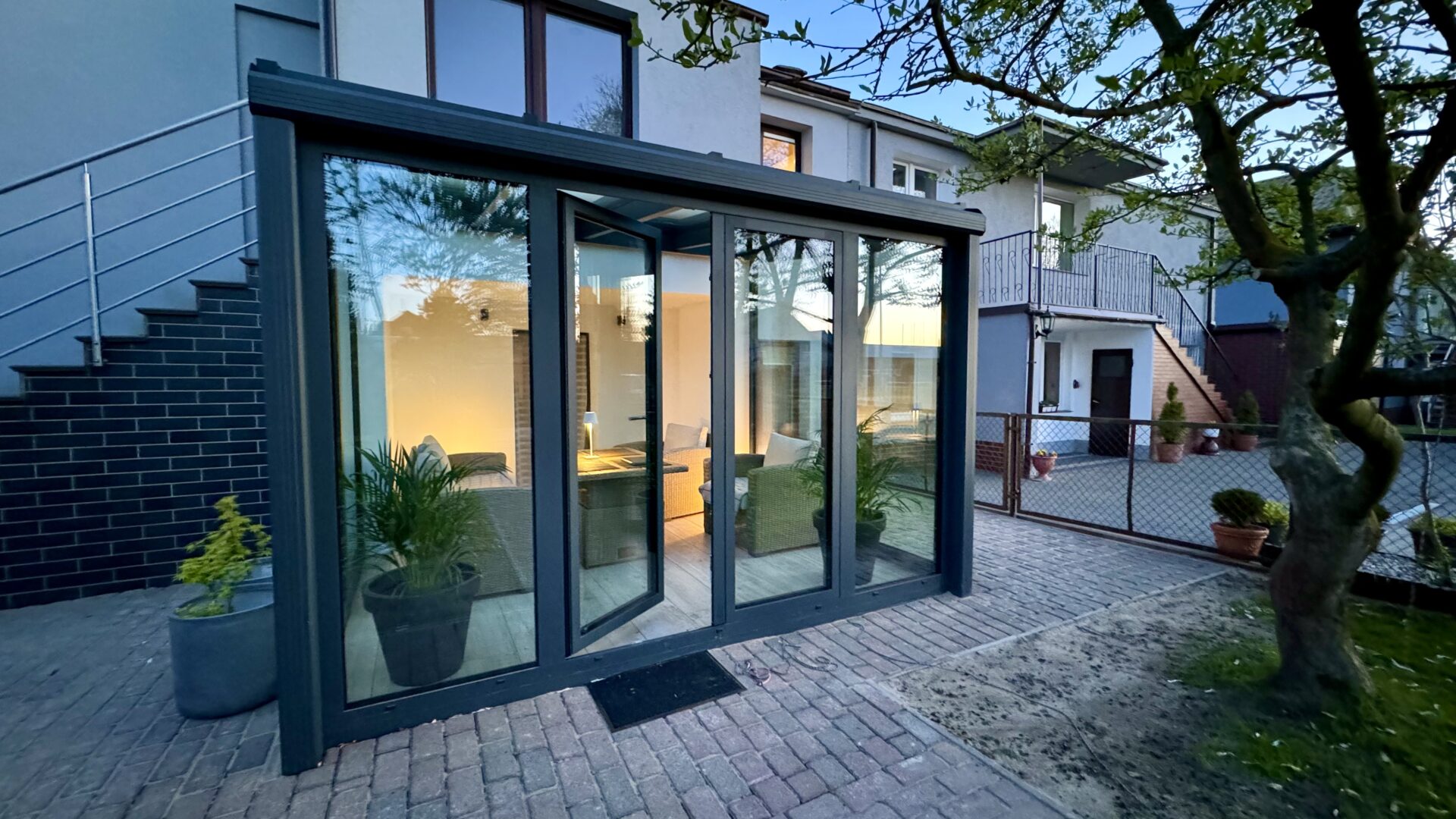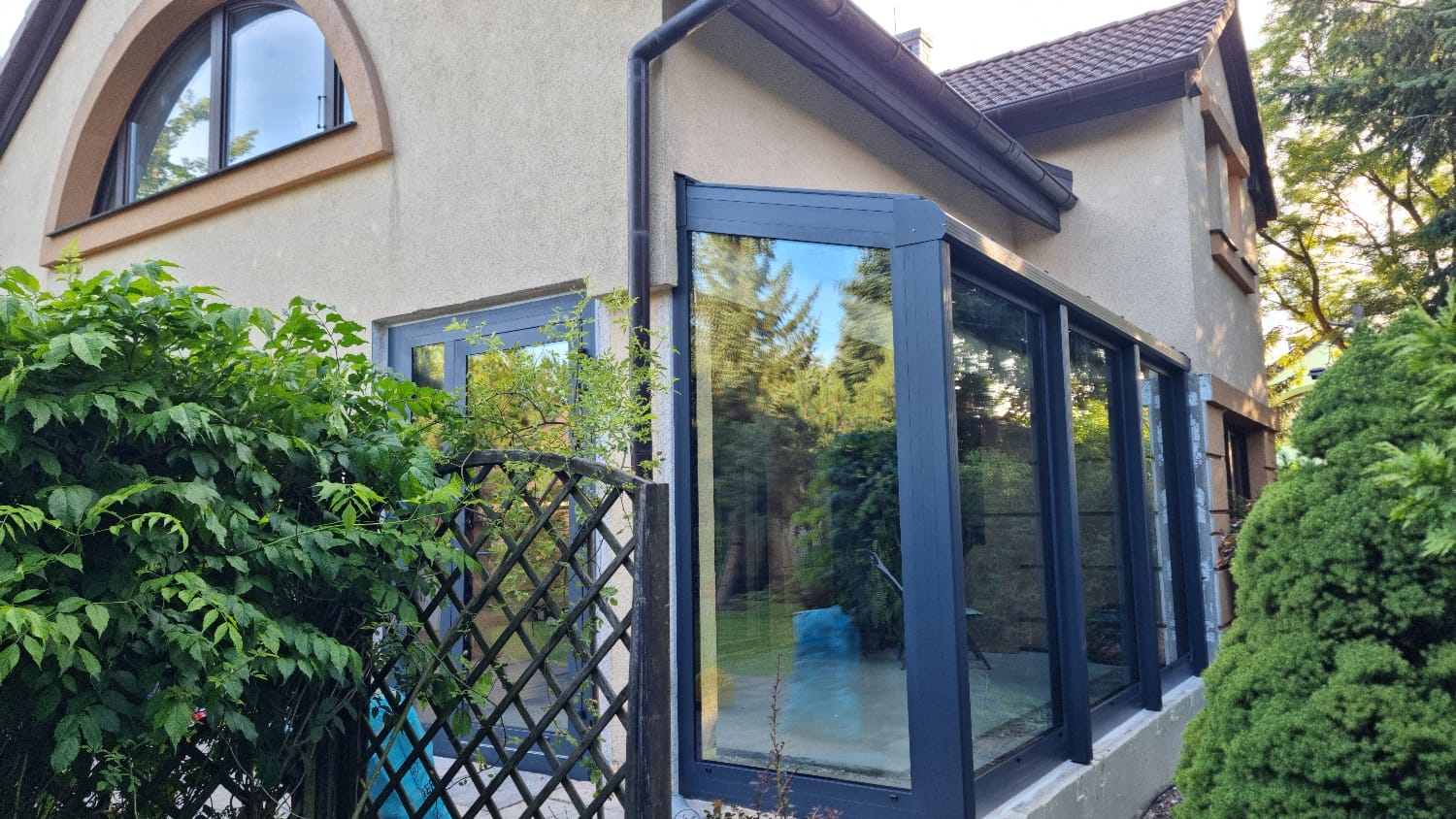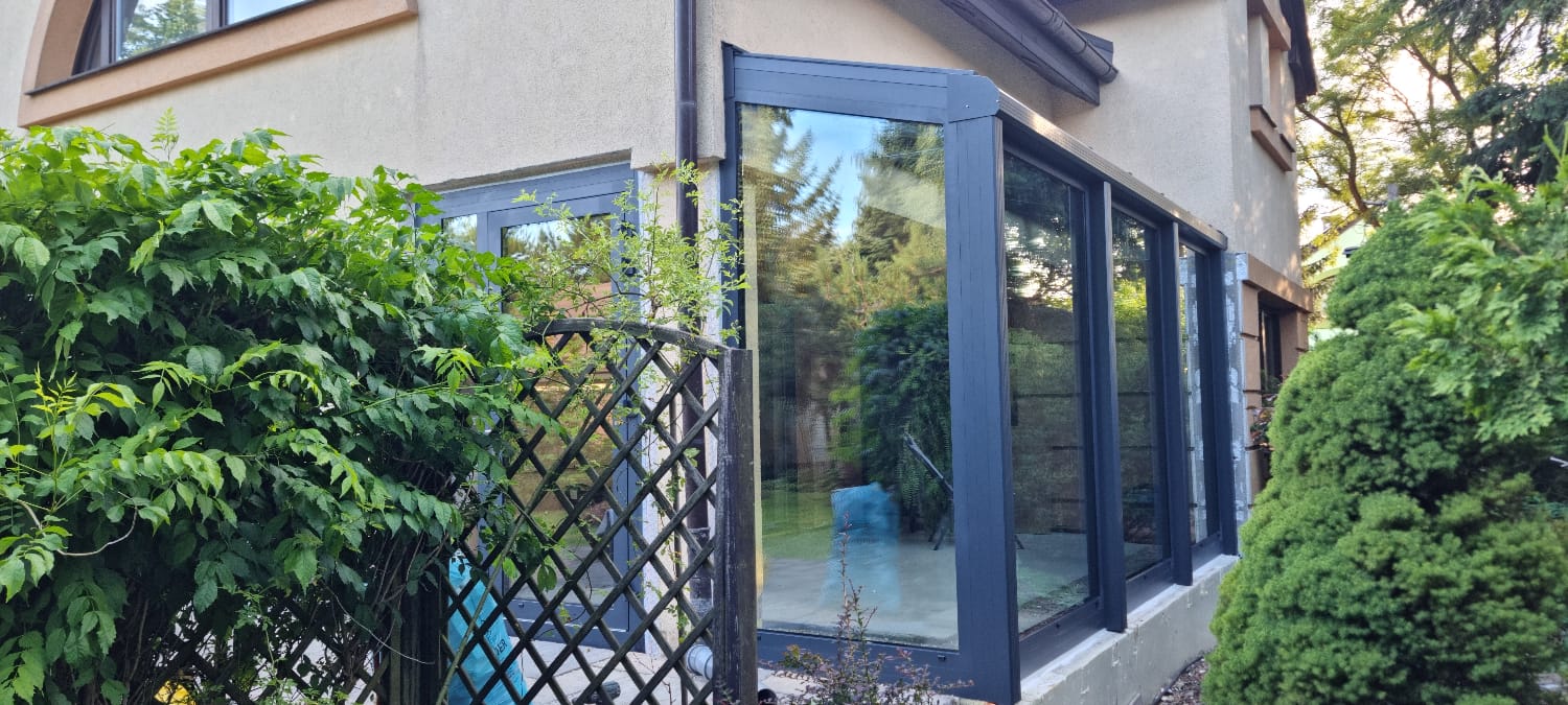 W miejscowości Kurek wykonaliśmy stylowy ogród zimowy w eleganckim odcieniu antracytu, który nadaje budynkowi nowoczesnej lekkości i wyrazistego charakteru.