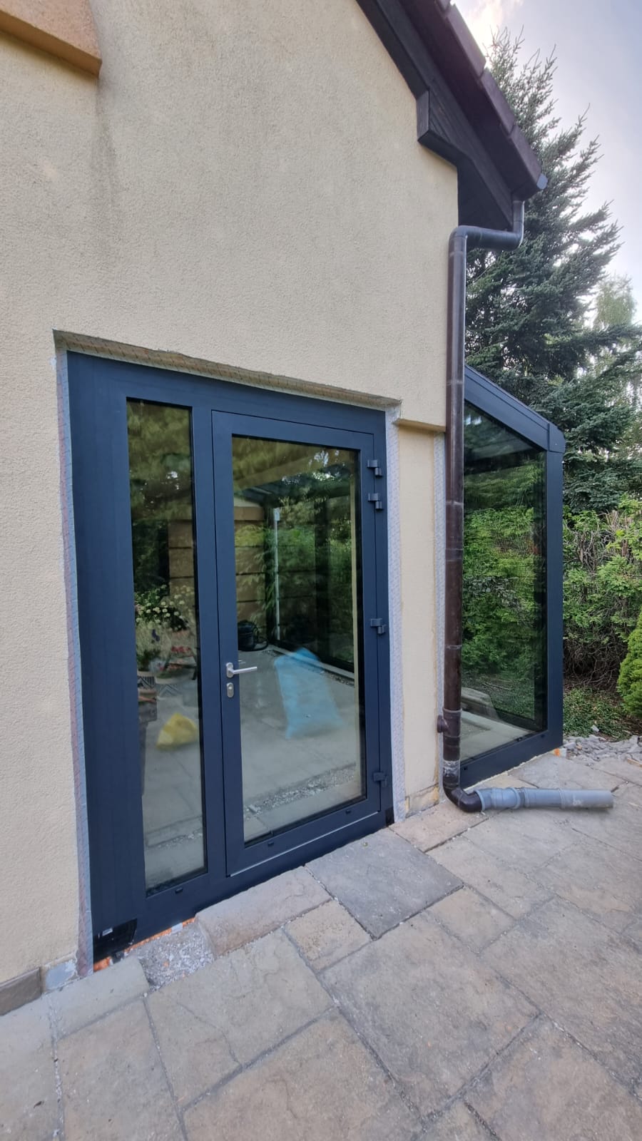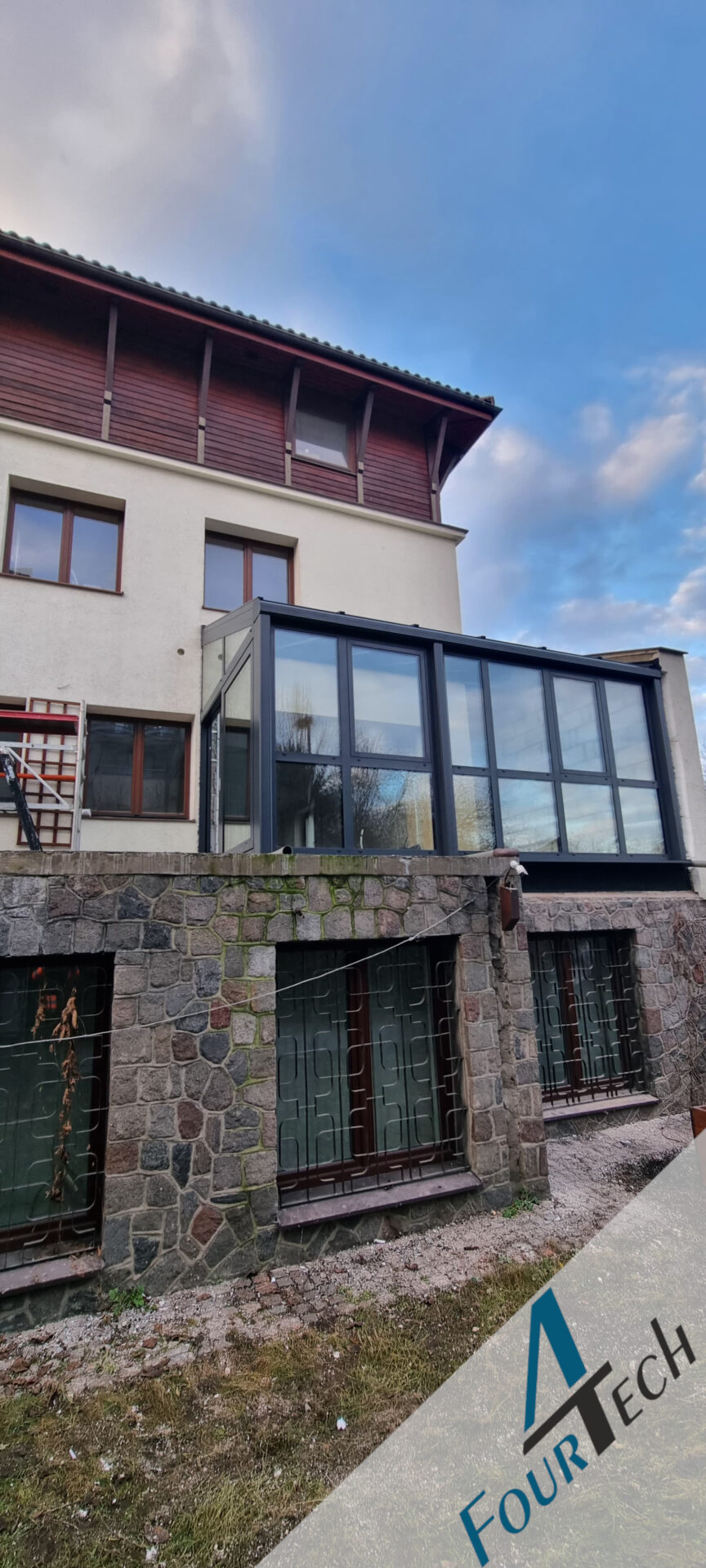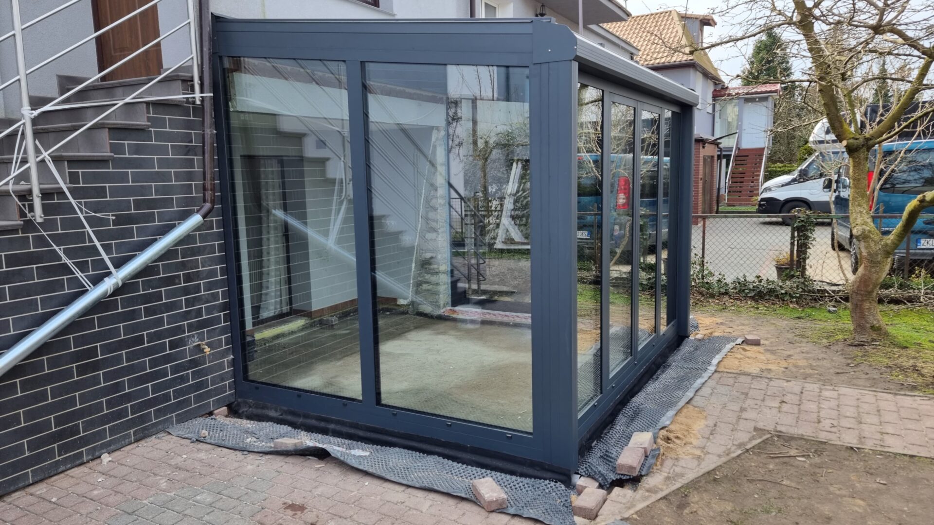 W miejscowości Kurek wykonaliśmy stylowy ogród zimowy w eleganckim odcieniu antracytu, który nadaje budynkowi nowoczesnej lekkości i wyrazistego charakteru.