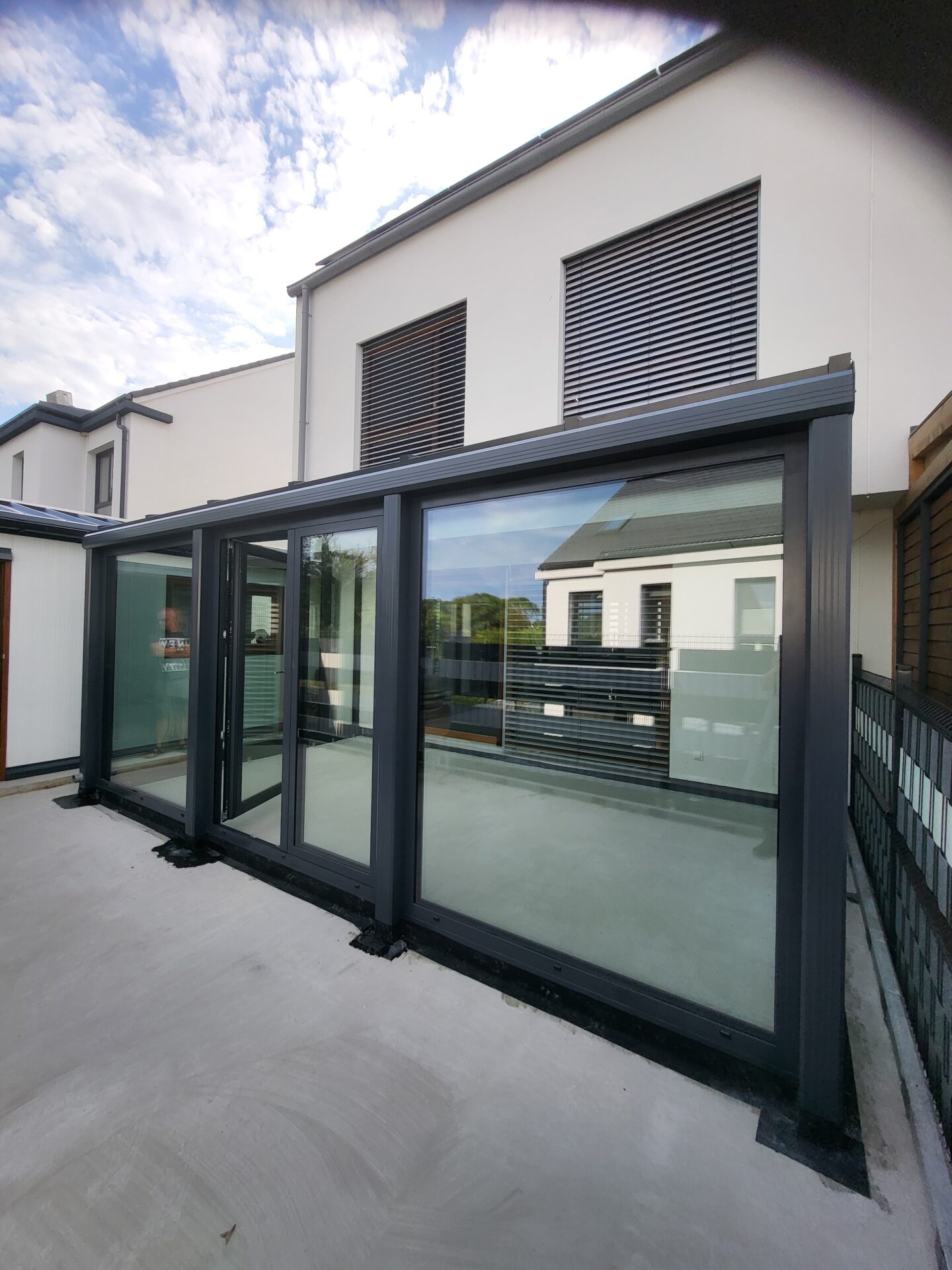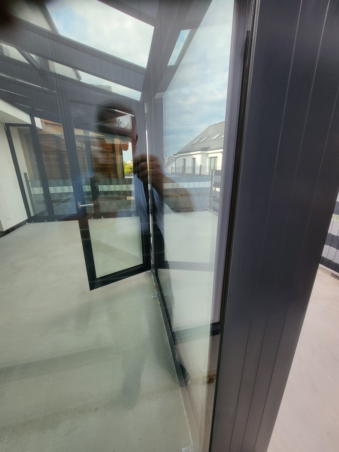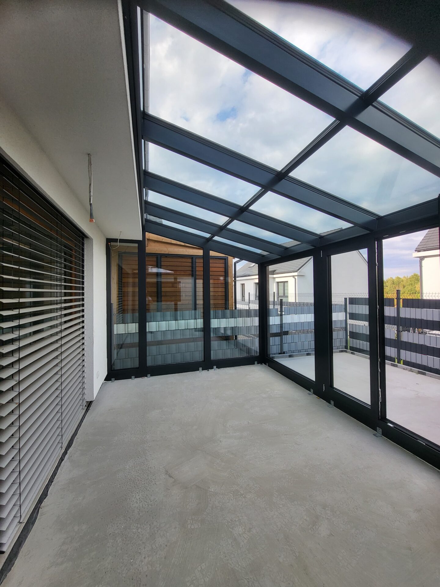 W Sopocie na piętrze budynku zrealizowaliśmy nowoczesny ogród zimowy w eleganckim antracycie strukturalnym,