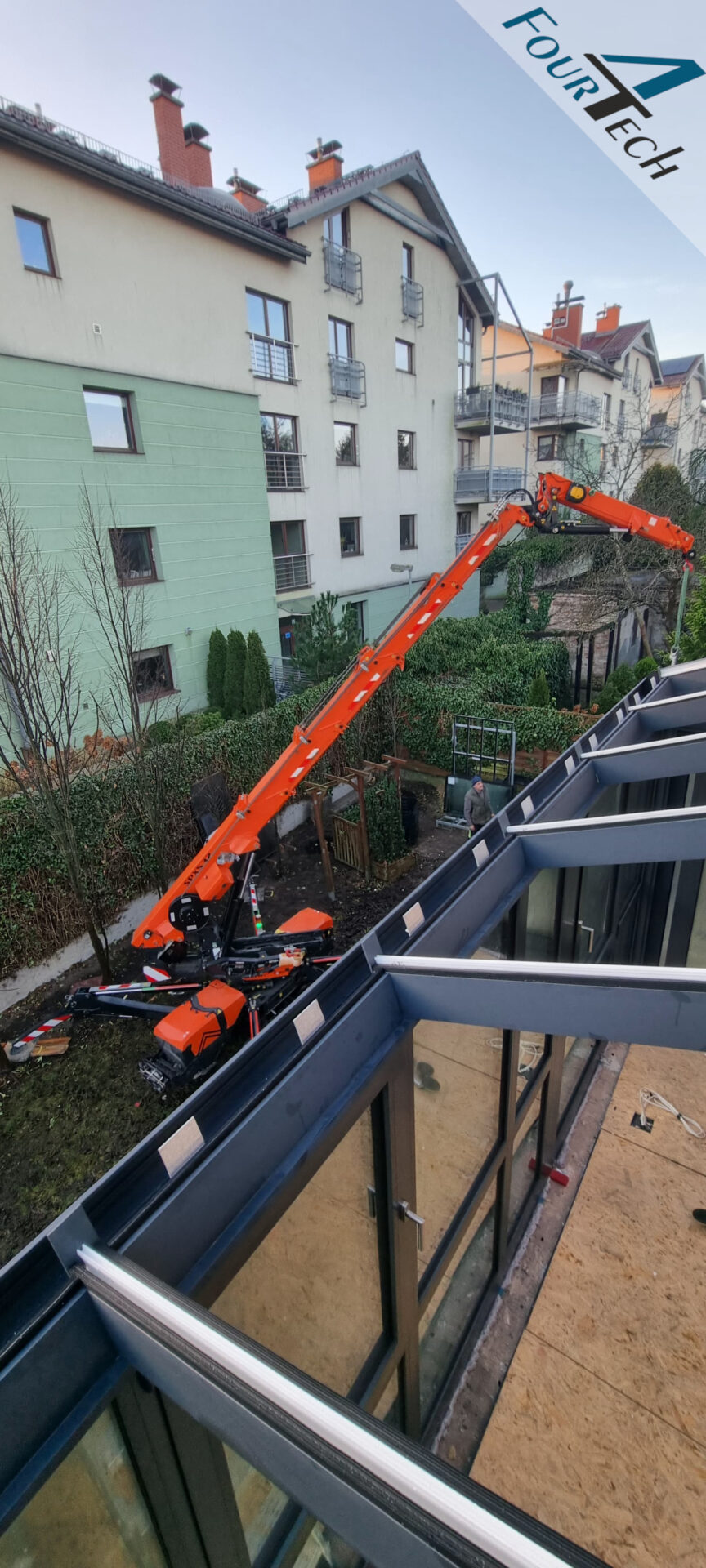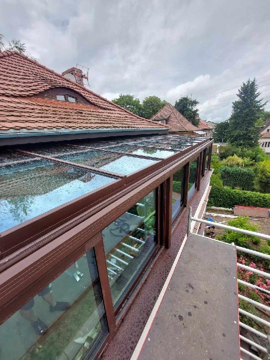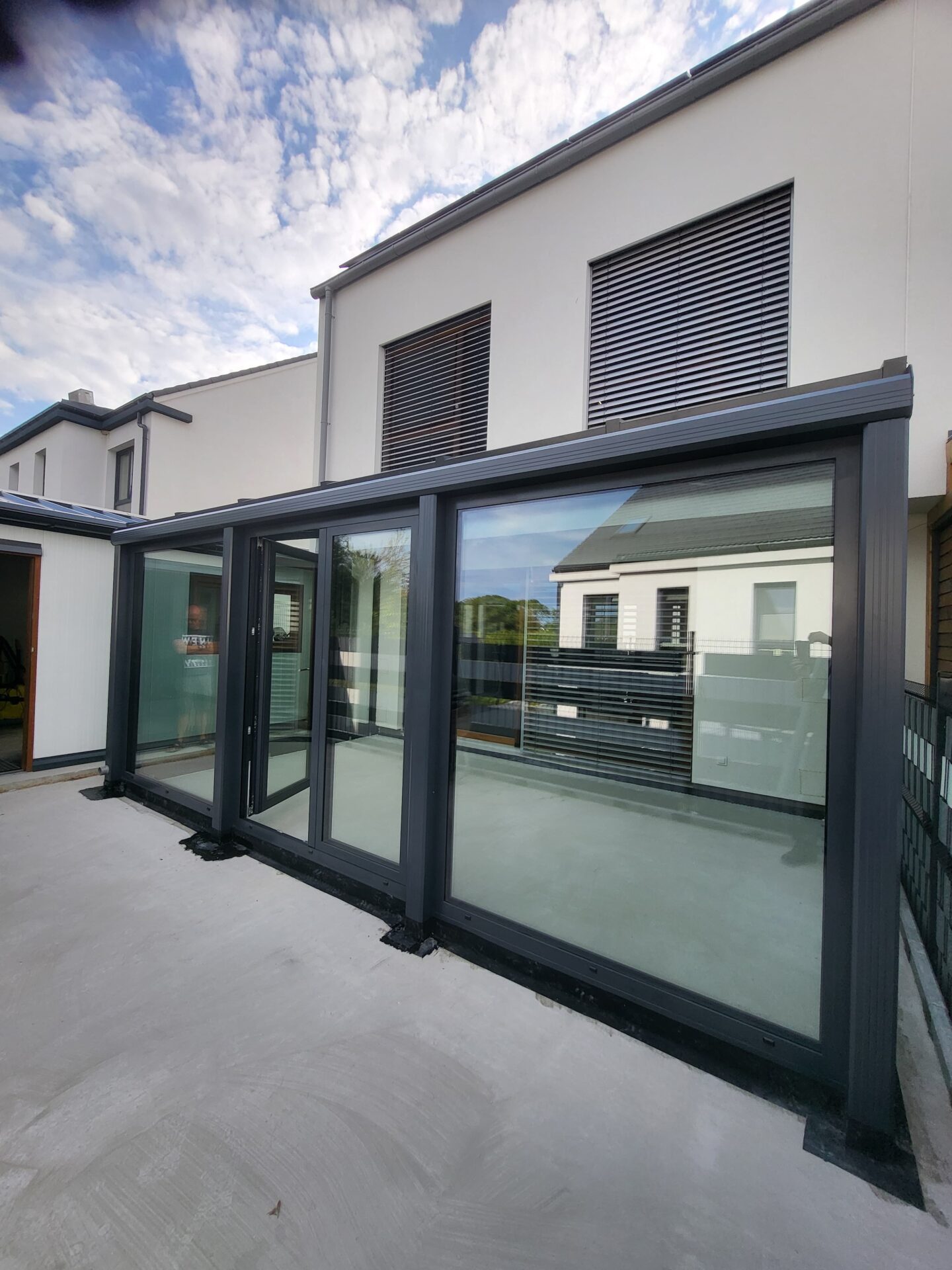 W Sopocie na piętrze budynku zrealizowaliśmy nowoczesny ogród zimowy w eleganckim antracycie strukturalnym,