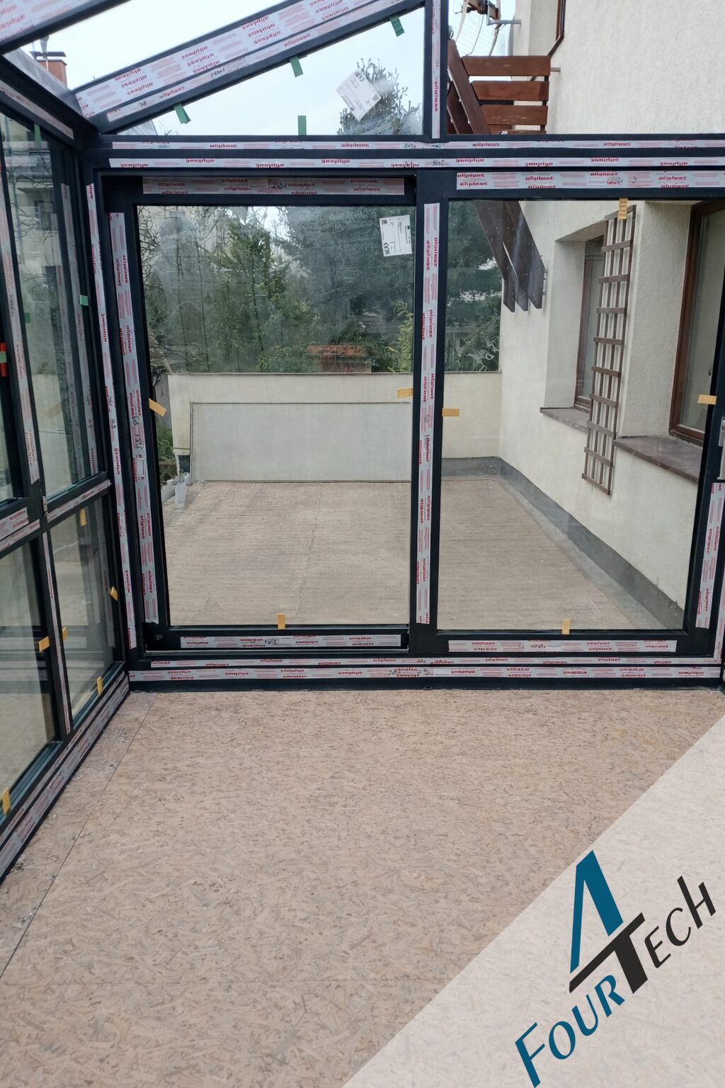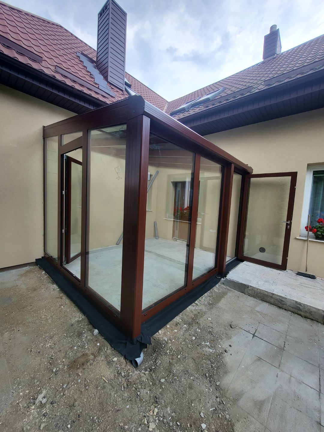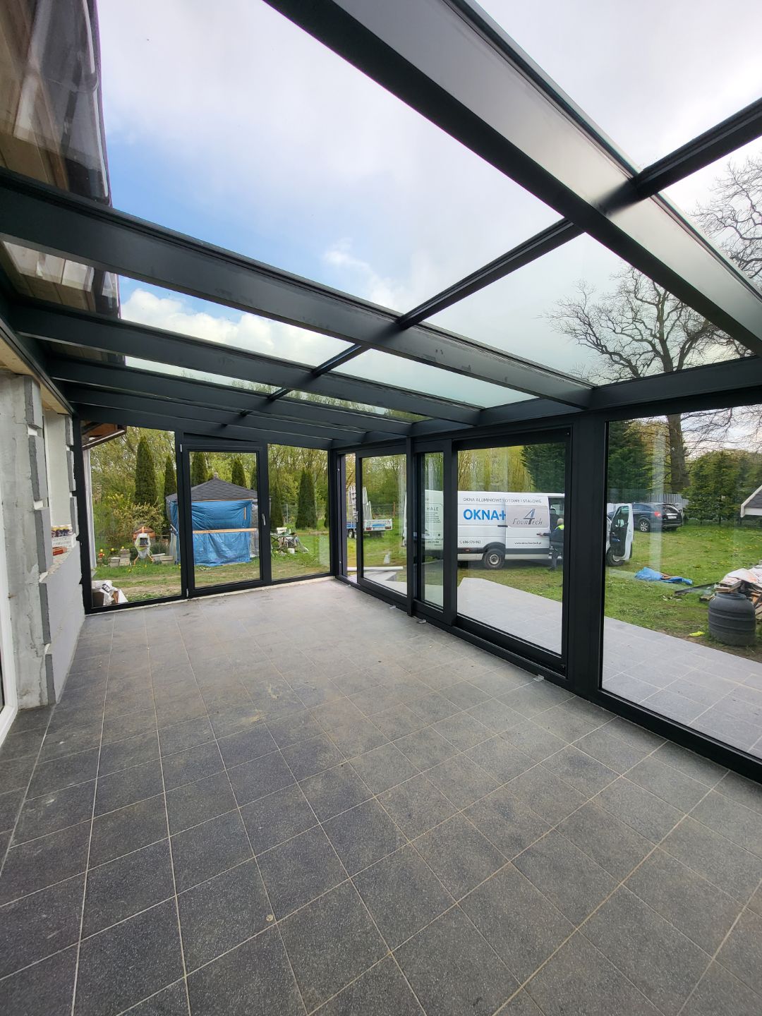 Realizacja w Kaliszu Pomorskim, ogród całoroczny z pakietem 3 szybowym, szkło antywłamaniowe P4, na froncie drzwi przesuwne z niskim progiem