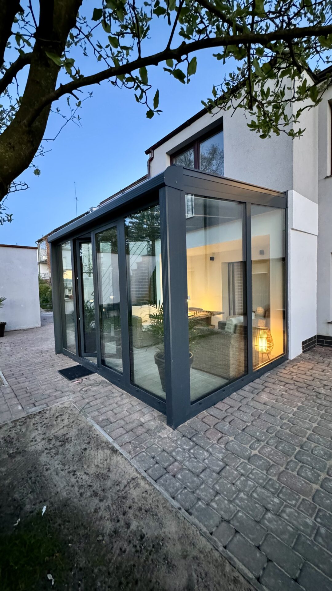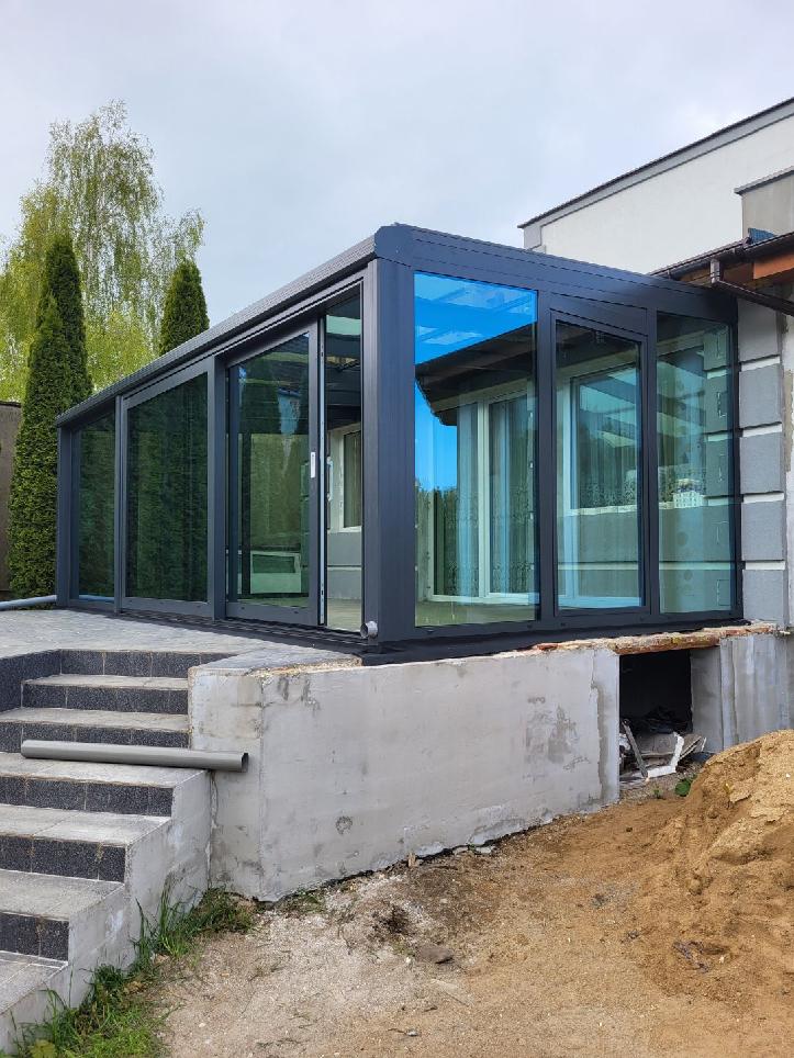 Nasza realizacja w Białuniu to nowoczesny ogród zimowy w eleganckim odcieniu antracytu. Zastosowaliśmy szklenie trzyszybowe, które gwarantuje świetną izolacyjność i maksymalny komfort cieplny. Subtelne detale i dopracowane wykończenie sprawiają, że przestrzeń zyskała wyjątkowy charakter – idealny do relaksu o każdej porze roku.