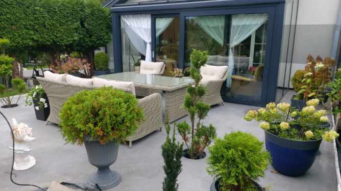 Ogród pięknie doświetla wnętrze, tworząc przytulną przestrzeń do relaksu i spotkań, a jednocześnie podnosi estetykę i wartość nieruchomości.