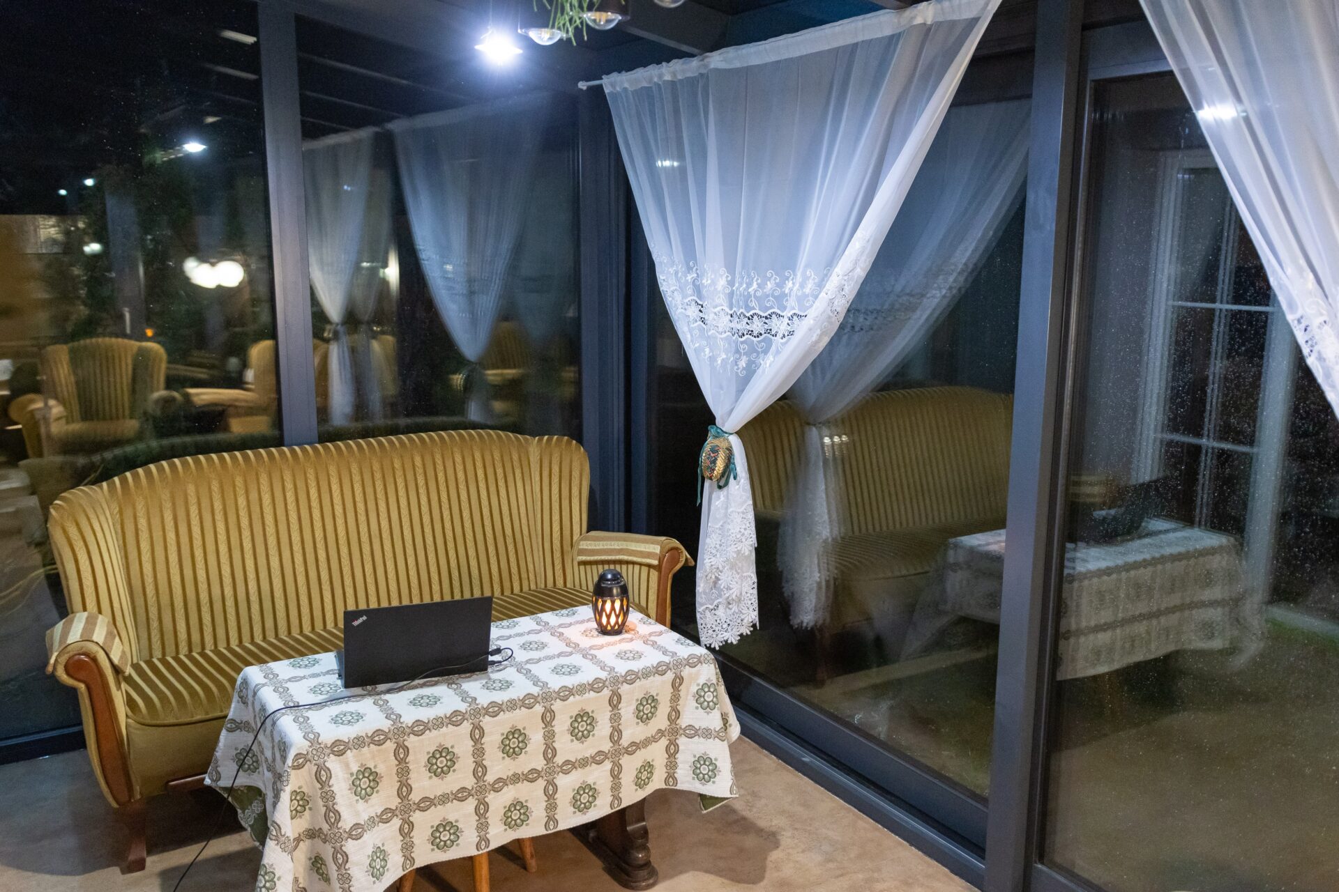 osłoniętym miejscem do wypoczynku z widokiem na miasto.