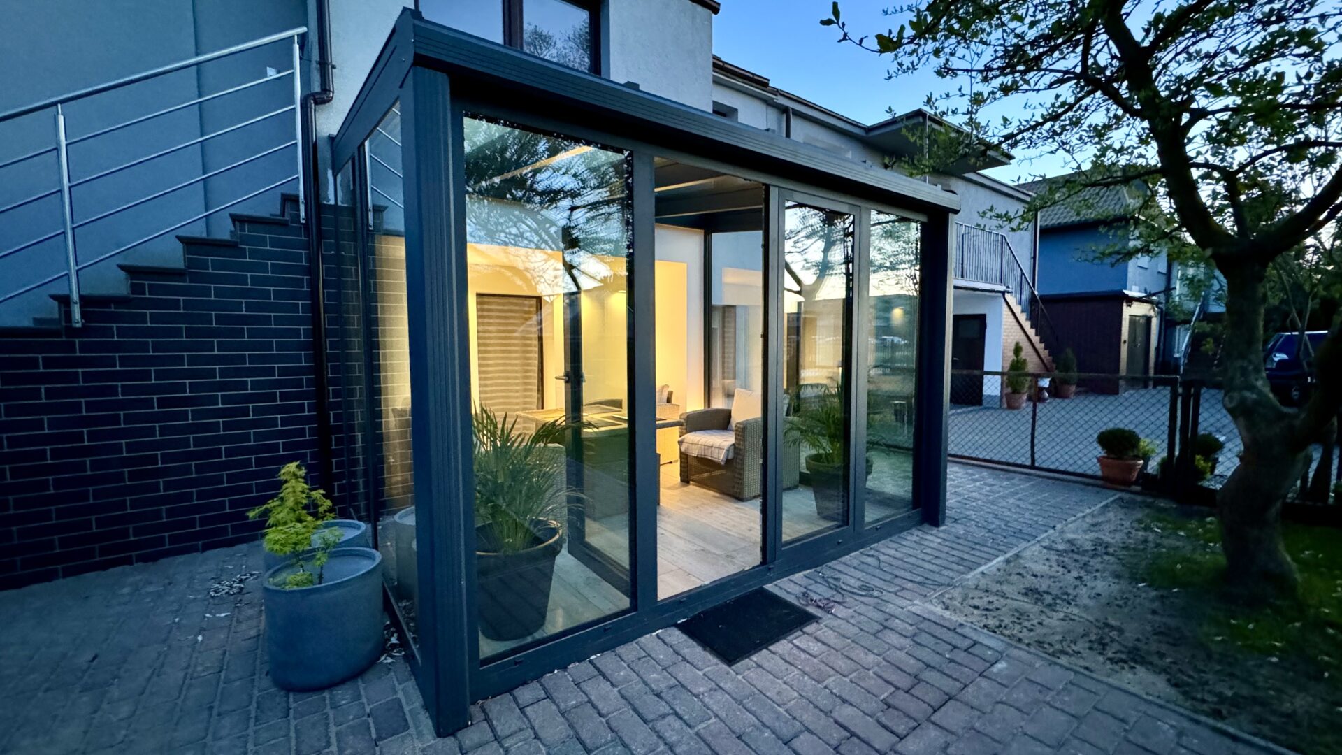 W Szczecinie wykonaliśmy stylowy ogród zimowy w klasycznym kolorze antracytu, który nadaje inwestycji nowoczesny i zdecydowany charakter.